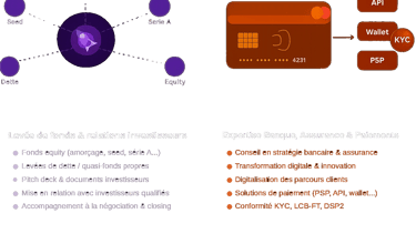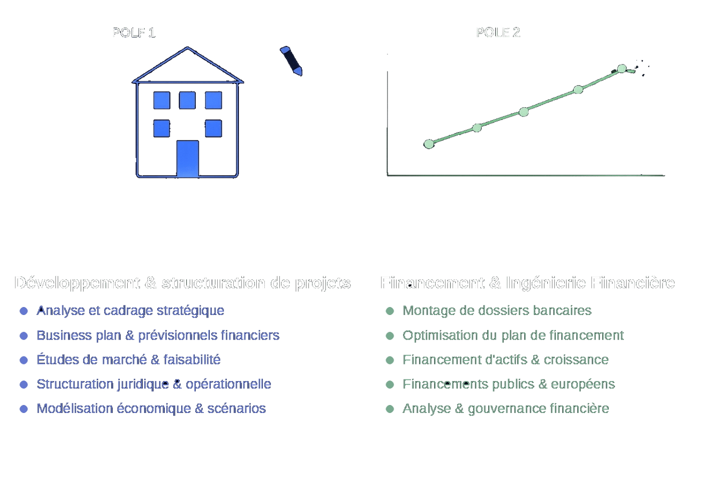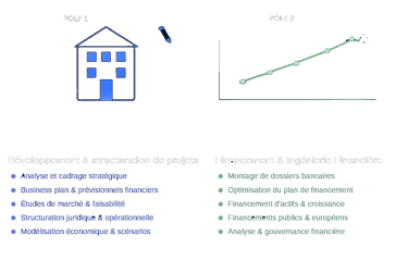 Financement & Levée de fonds — Nous accompagnons nos clients dans la mobilisation des ressources financières adaptées à leurs projets : dette bancaire, capital-investissement, financements structurés ou instruments hybrides. Notre réseau d'investisseurs institutionnels et de partenaires financiers garantit un accès privilégié aux meilleures sources de financement.