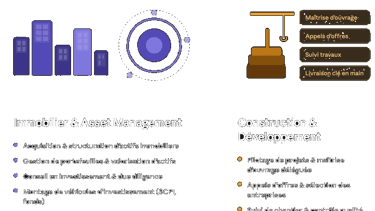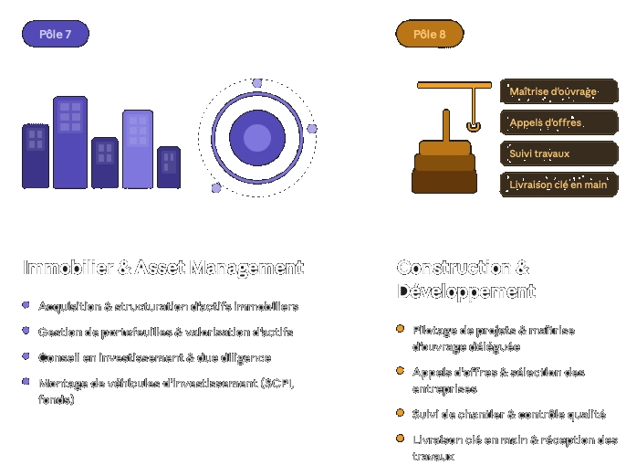Chaque pôle repose sur une équipe de spécialistes aguerris, dotés d'une connaissance approfondie des marchés et d'une capacité d'exécution éprouvée. Ensemble, ils forment un écosystème de compétences intégré, capable d'accompagner nos clients à chaque étape de leur développement — de la structuration initiale jusqu'à la réalisation finale de leurs projets.