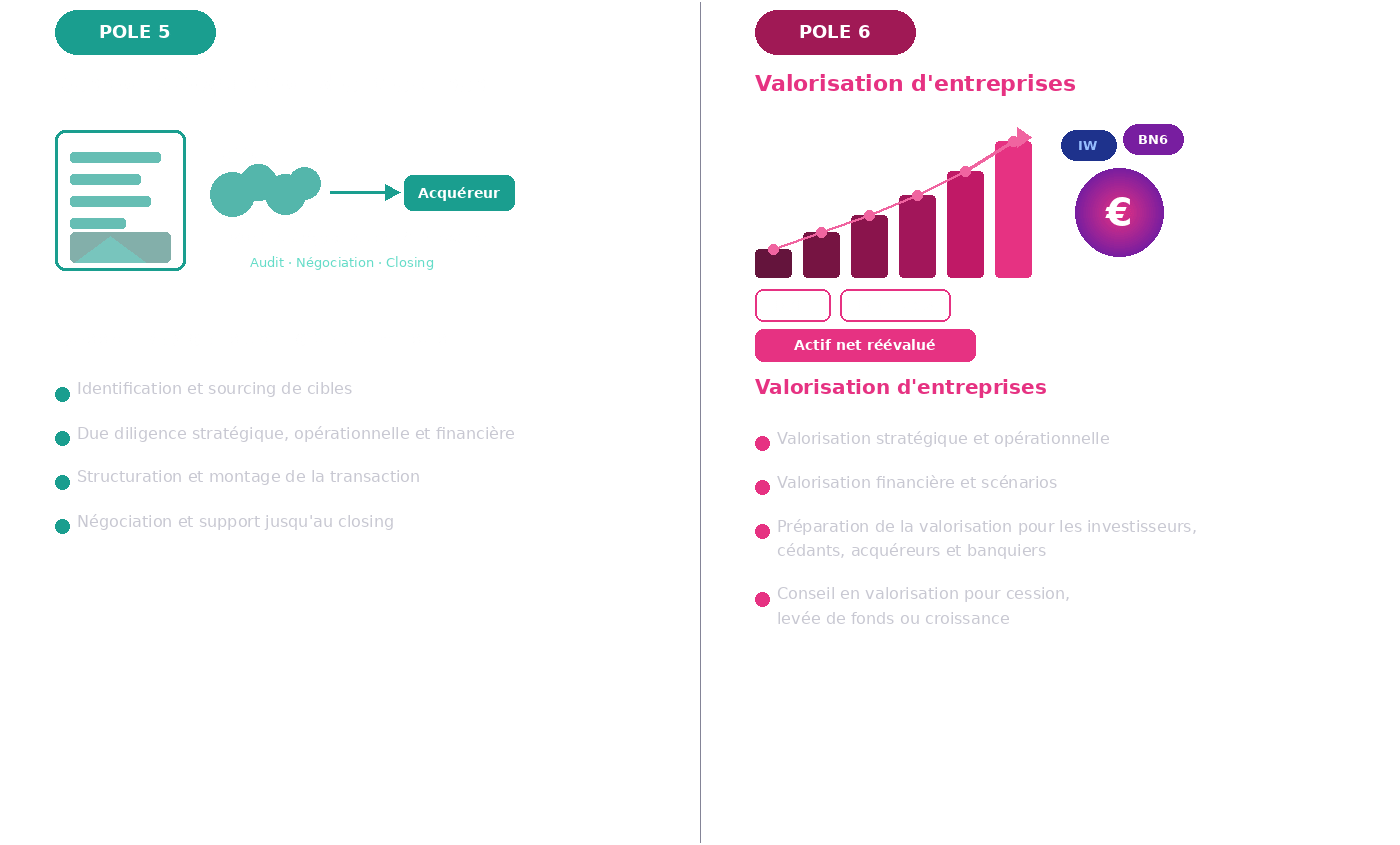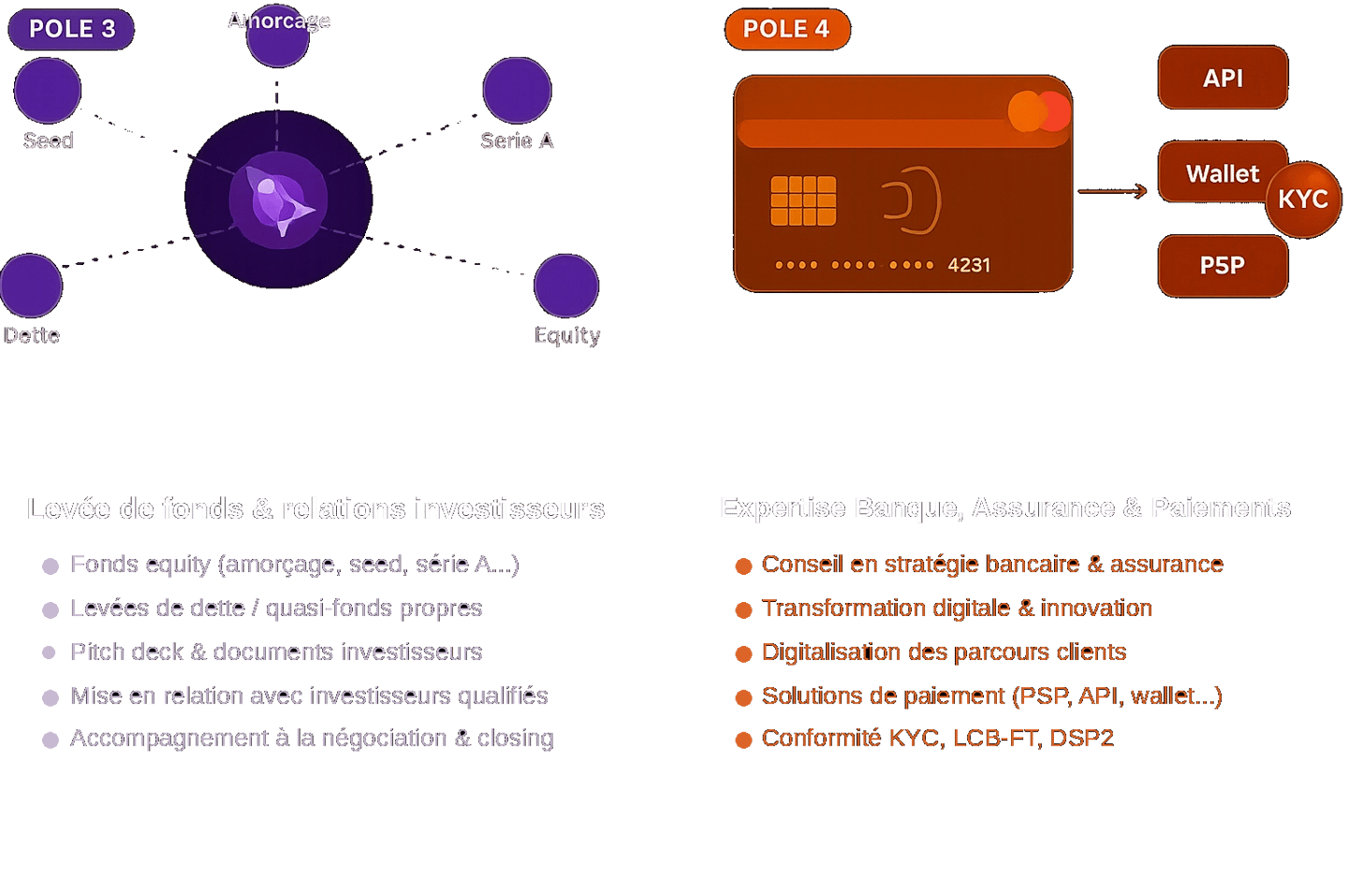 Des experts, pas des généralistes — Chaque pôle est animé par des praticiens issus du terrain : banque, finance, stratégie, digital.