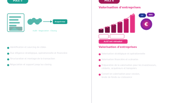 Valorisation d'entreprises — Notre pôle valorisation délivre des analyses financières indépendantes et rigoureuses, mobilisant les méthodes reconnues — DCF, multiples de marché, actif net réévalué — pour fournir une évaluation fiable et défendable, que ce soit dans un contexte de cession, de levée de fonds ou de litige.